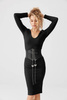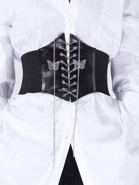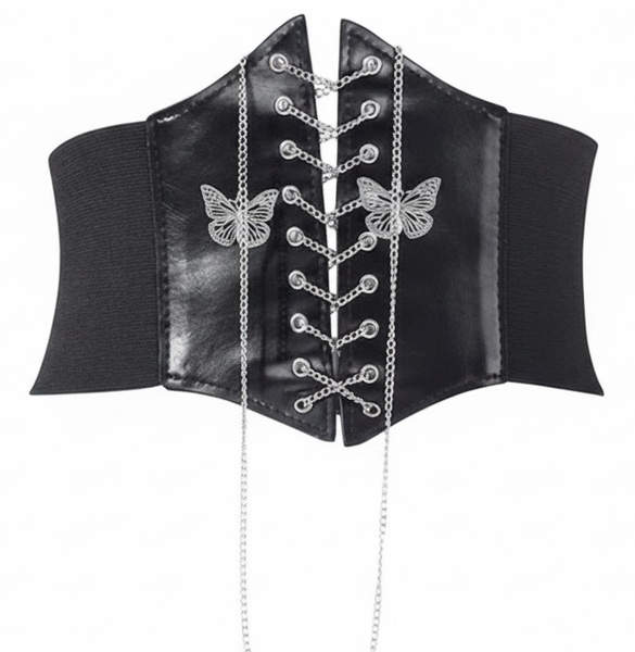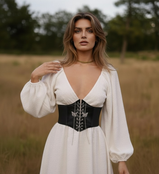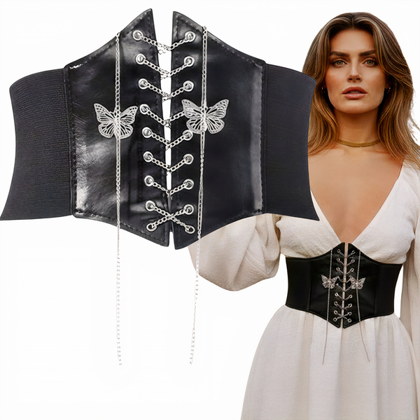 Przód paska jest wykonany ze skóry ekologicznej połączonej z szeroką gumą dzięki której pasek jeszcze lepiej dopasowuje się do ciała tworząc piękną kobiecą talię. Efekt gorsetu tworzy wiązany przód , który dodatkowo zdobią srebrne zaczepy . Tył zapinany na mocne napy. Pasek wysokiej jakości oraz wykonany z dbałością o najmniejszy szczegół.
